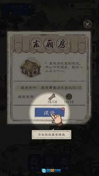 接下来要建造一些屋舍给弟子们住,在标有“建筑”的位置点击建造,之后就会出现东厢房、西厢房这类不同的屋舍命名,这些带着怀旧感的命名还挺注重细节的,具体如图所示: