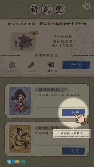 初期的屋舍建造完成后,没有弟子可不行,不然多尴尬啊。所以接下来得去“讲武堂”招些弟子来壮大咱们门派的实力。操作方法很简单,只要点击“讲武堂”,就会出现对应的界面,里面有银牌招募令和金牌招募令。而且初期这些招募都是免费的,就像图里展示的那样。