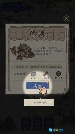 若想培养更多弟子,需建造一座伙房,伙房是制作食物的地方,升级伙房能够提升食物上限,加快食物恢复速度。