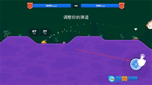 进入游戏后,调整右侧的弹道控制按钮,留意坦克炮弹的发射轨迹。