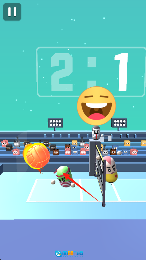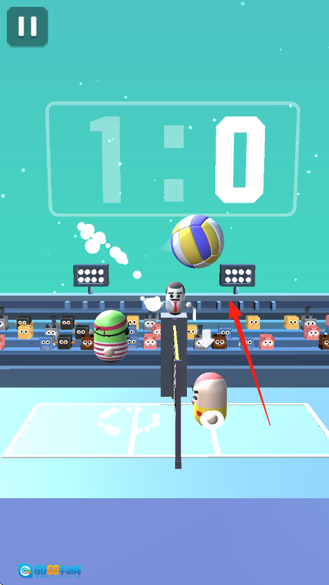 2、实时对抗环节设在排球场地,你将与多角色的对手展开对战。通过点击屏幕来操控角色完成移动、击球等动作,双方围绕球权展开激烈争夺,得分后比分会相应变化(例如从1:0更新为2:1)。