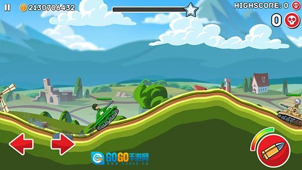 2、接着正式进入游戏,左下角的左右箭头分别控制战车的前进和后退,右侧的是射击按钮,头顶的绿色血条代表自己战车的生命值,要注意以最小的损伤来获取更多胜利。