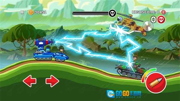 就像图片里的坦克那样,主炮负责攻击前方的敌人,火箭则用来对付后面的敌人,在敌人刚冒头时就把它们消灭掉,这样坦克上方就全是晴朗的天空,我们就能轻松通过关卡了。