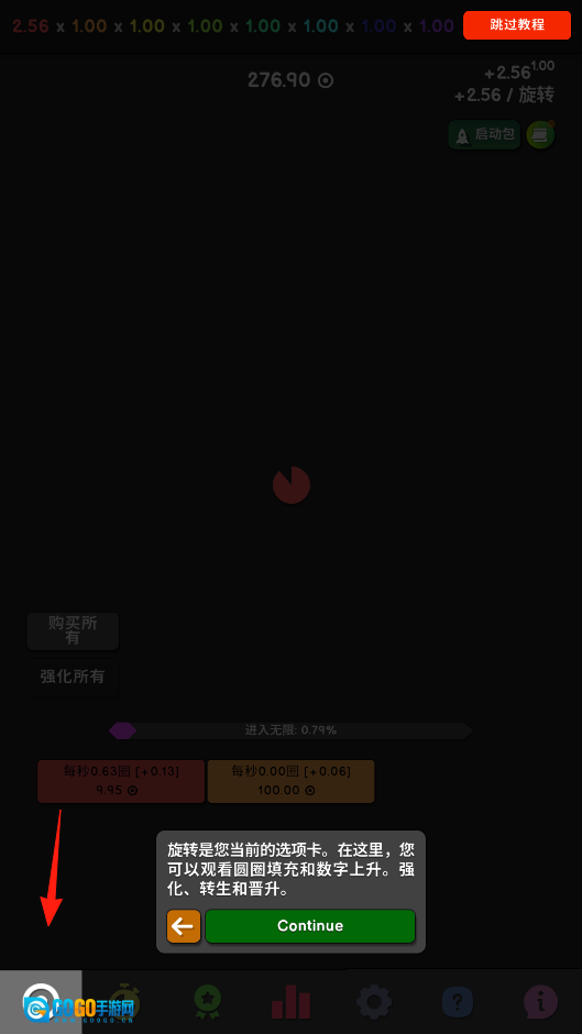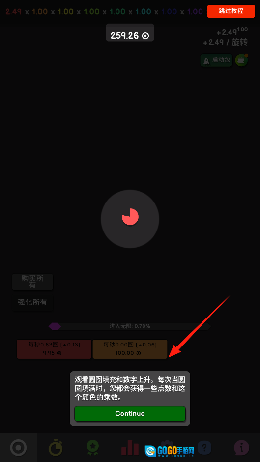 1、进入革命空闲状态后,界面会显示圆圈填充效果及对应的数值说明,点击Continue按钮可继续推进教程流程。此时需观察圆圈的填充进度,待其填满后即可获取点数与颜色乘数,借助这一机制积累资源,从而体验基础的成长玩法。
