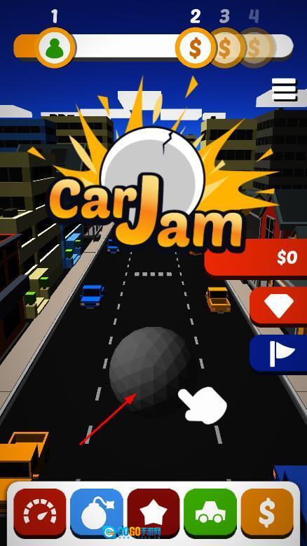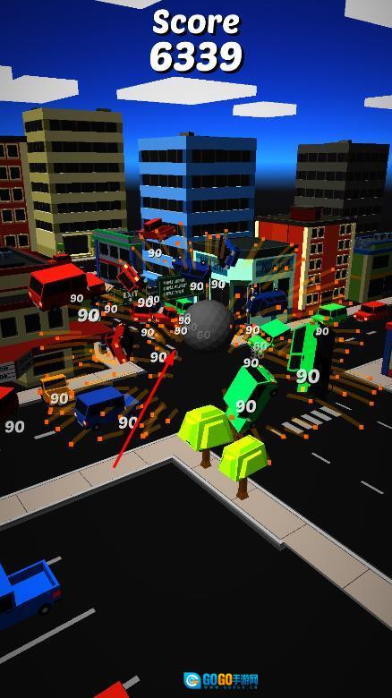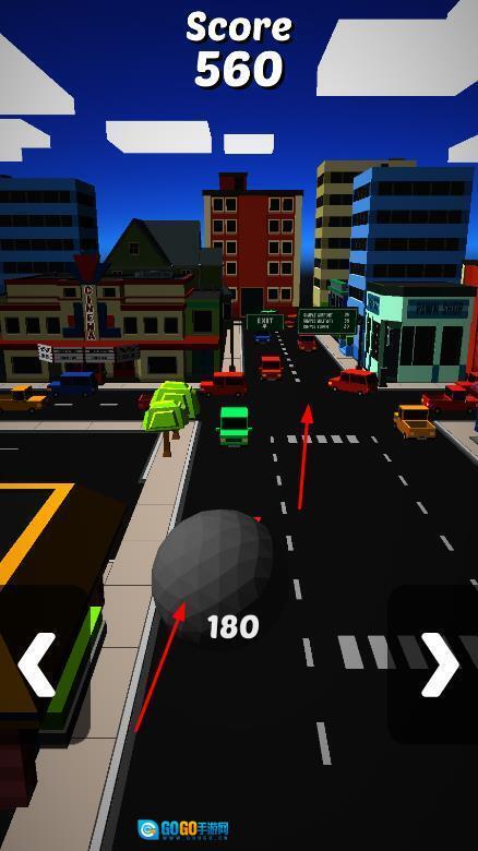 2、借助屏幕左下角与右下角的左右方向按钮来操控球体的移动方向,当球体撞击到道路上的车辆时,每成功撞击一辆车,就能得到对应的分数。
