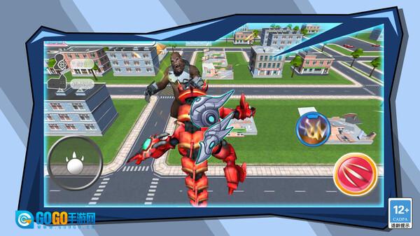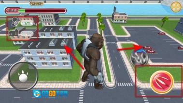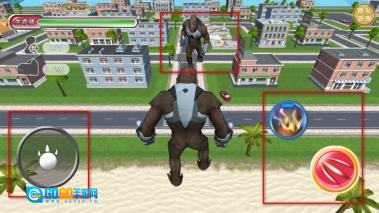 2、操控金刚在城市里移动,左边的按钮用来控制移动方向,右边的技能按钮能够释放各类技能,对城市建筑等目标实施破坏。