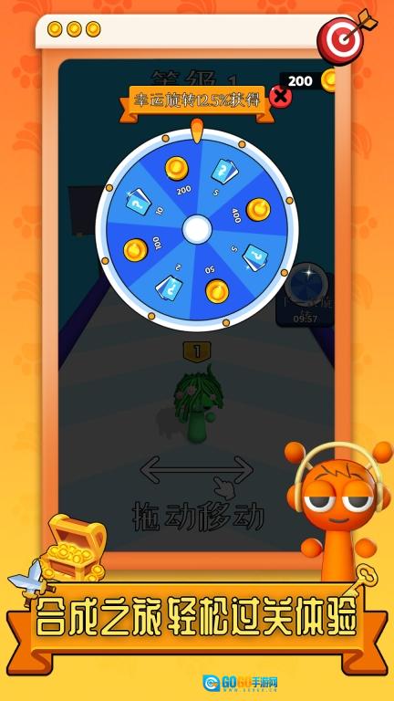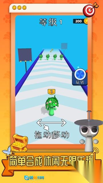 1、玩家控制角色在跑酷赛道上前行,借助合成相同的角色或道具来提高等级和能力。