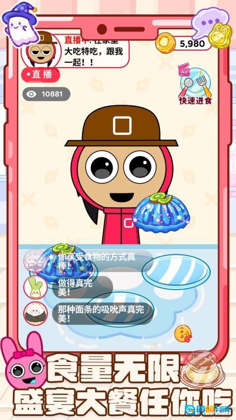 3、吃货等级提升机制:通过完成吃播相关的任务与挑战来进阶吃货等级,等级提升后可解锁更大的食量上限以及快速进食、食物特效展示等特殊技能,从而让吃播表演更具观赏性。