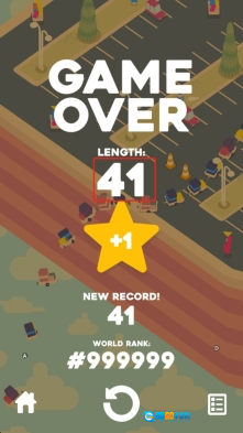 3、游戏结束后,界面会显示GAME OVER,本次行驶的距离为41,得到1星奖励,新纪录也会同步更新,你可以点击重新开始按钮继续进行挑战。