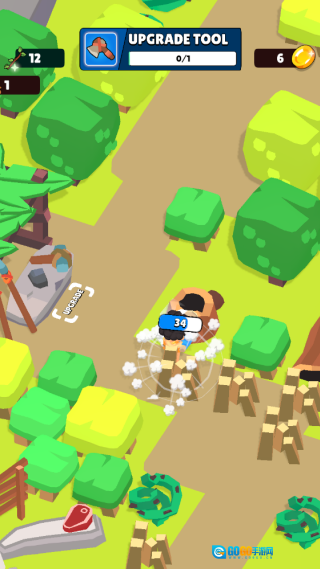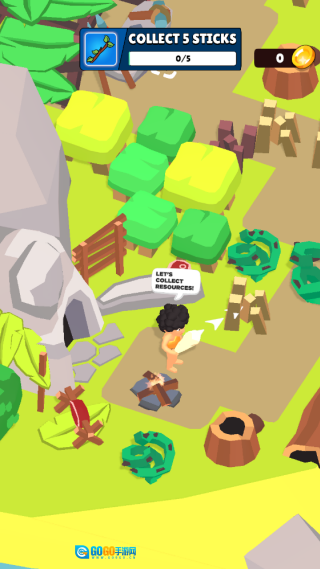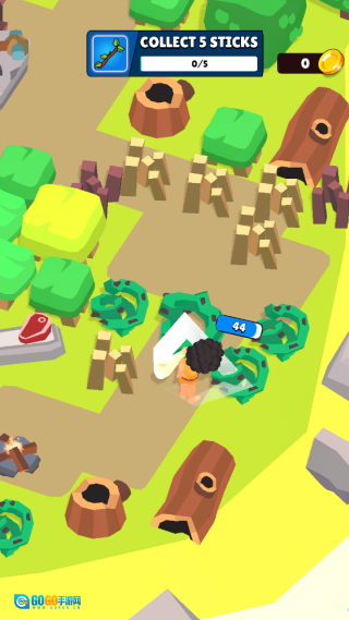 2. 完成第一个任务:收集树枝。当角色靠近灌木丛或树木时,会自动进行砍伐操作。
