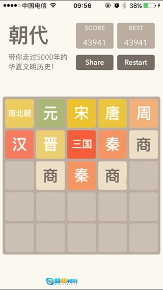 欢迎来到2048朝代版,这是一款将经典数字益智游戏与中国五千年朝代更迭历史巧妙结合的创新之作!在这里,每一个数字方块都代表着一个历史朝代,从夏商周到元明清,你需要运用智慧和策略,让华夏文明在你的指尖得以延续和融合。每一次滑动,都是对历史的重新诠释;每一次合并,都是王朝的兴盛与更替。你准备好开启这段穿越时空的智力挑战了吗?