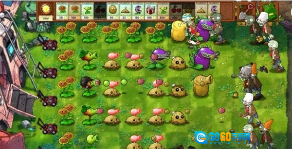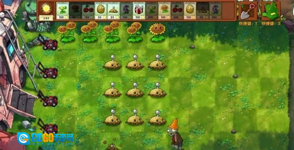 2、用高度超过向日葵的坚果来保护其中一路,其余路径则可以全部种植“豌豆土豆雷”与“豌豆坚果墙”。
