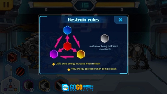 2、机甲兽的正下方设有技能系统,不同技能对应不同颜色标识,这是由于技能间存在相互作用与克制关系。若能巧妙利用技能属性的克制机制,即便自身战力稍逊一筹,也能轻松击败对手。
