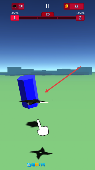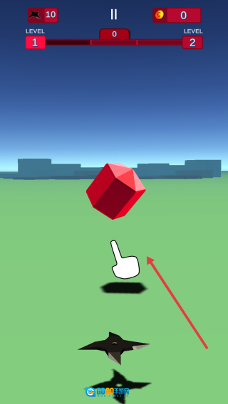 2、按照白色手指的提示,拖动飞镖并射向红色立方体,每命中一次,敌方的“LEVEL2”进度就会减少。