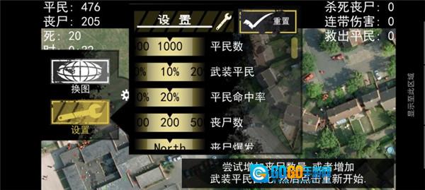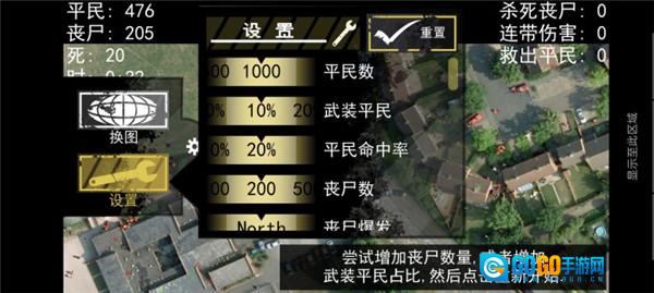 点击界面右上角的设置按钮,就能对平民与僵尸的各项参数展开细致设置,涵盖平民数量、武装平民的占比、僵尸数量、僵尸的移动速度以及僵尸的出现位置等诸多选项。