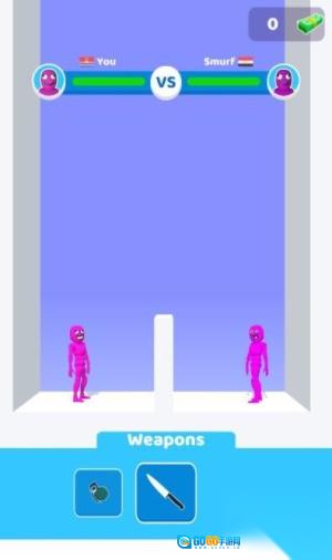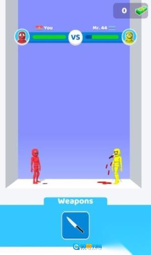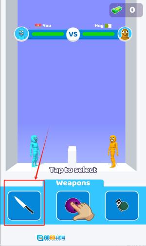 1、在游戏初始界面,点击红框标注的“Tap to select”提示,接着从底部的武器栏里挑选刀、拳套或者飞镖之类的装备,选好之后角色就会自动穿戴对应的武器,为对战做好准备。