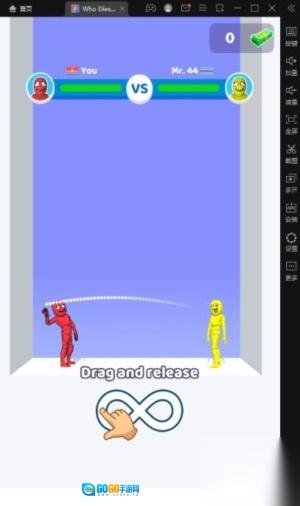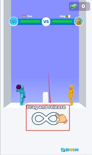 2、进入对战界面后,根据红框内“Drag and release”的提示,拖动蓝色角色手中的紫色球体来调整攻击的力度与角度,松开手指即可将球体投向对面的橙色角色发起攻击。