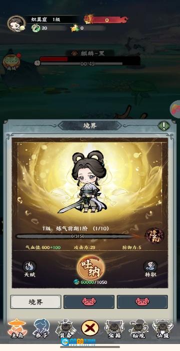3、要记得进入角色页面,对吐纳进行升级,这样才能让你的属性持续得到增强。