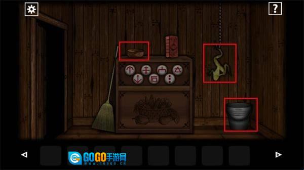 4、在这个房间里,你可以在桌上拿到木碗,从墙上取下青蛙装饰,还能找到铁桶;另外,查看桌面上的菜谱能获取相关提示。
