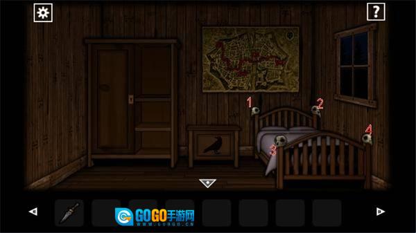 1、首先在场景里,点击床头柜上的四个骷髅头,按照1221的顺序点击后,乌鸦所在位置的柜子就会打开。在柜子中间能拿到火柴。