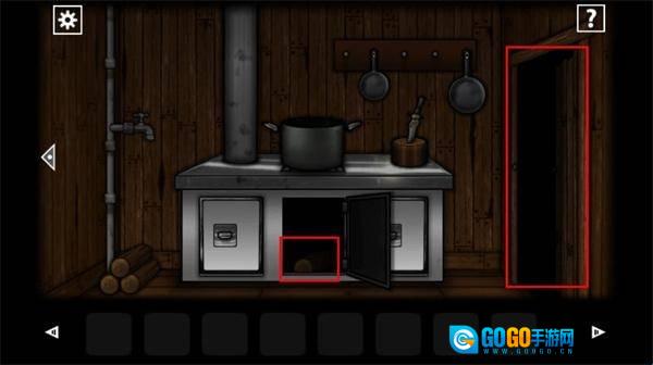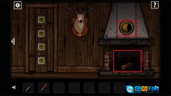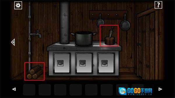 2、离开当前位置来到厨房,在左下角处拿到木柴,再从右上方的砧板上拿到刀。