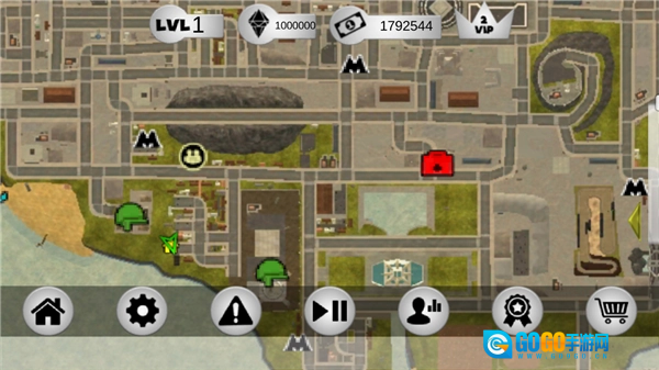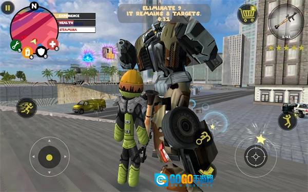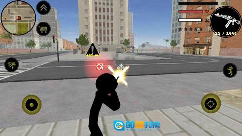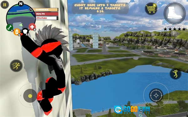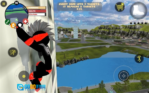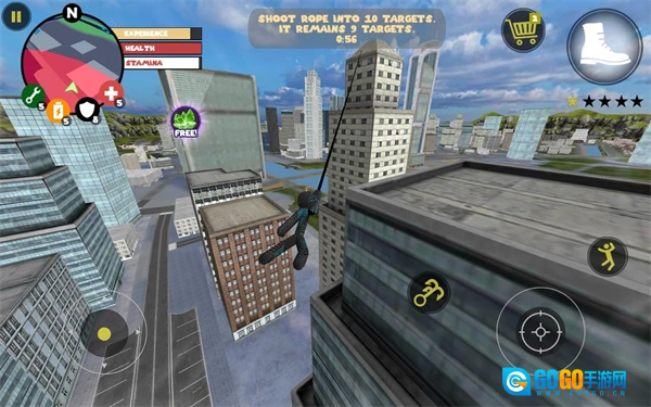 左侧负责移动与加速,右侧对应绳索和攻击(含跳跃功能),跳跃操作独立设置;画面右上区域的武器切换功能,以及血量、经验的数值都保持实时更新,状态信息清晰可见。玩家可自由选择玩法,与其他帮派成员展开交火——击杀敌人能获取经验,连续击杀会累积星级,此时警察及周边角色会重点针对你发起猛烈攻击。如何在冲突中存活、并成功消灭对手,正是需要完成的核心任务。