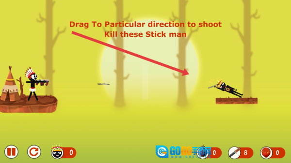 3、进入关卡后,根据提示“Drag-To-Particular-direction”,通过拖动屏幕来控制射击方向,消灭敌方火柴人。