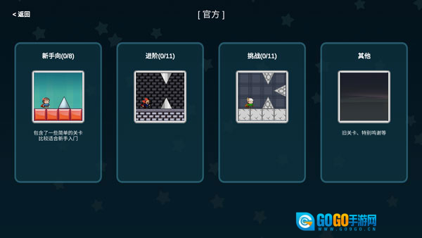 目前关卡总数为31张,具体分类如下:2张教程关卡、11张跳刺关卡、6张解谜关卡、4张特殊玩法关卡、3张坑向关卡、2张小游戏合集关卡、1张Boss战关卡、1张探索关卡,以及1张包含36个小关卡的世界关卡。