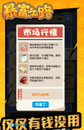 我把这款《暴富之路》安卓版推荐给各位,在机遇与能力的双重助力下,你最终会拥有一家属于自己的公司。不过要知道,仅仅有钱可没法赢得最终胜利,就看你能不能抓住机会,用心经营自己的小店。其实你只需找到自己最向往的人生方向,然后拼尽全力去赚钱就行啦!赶紧来12365网体验一番吧!