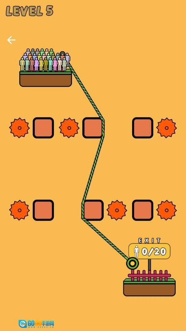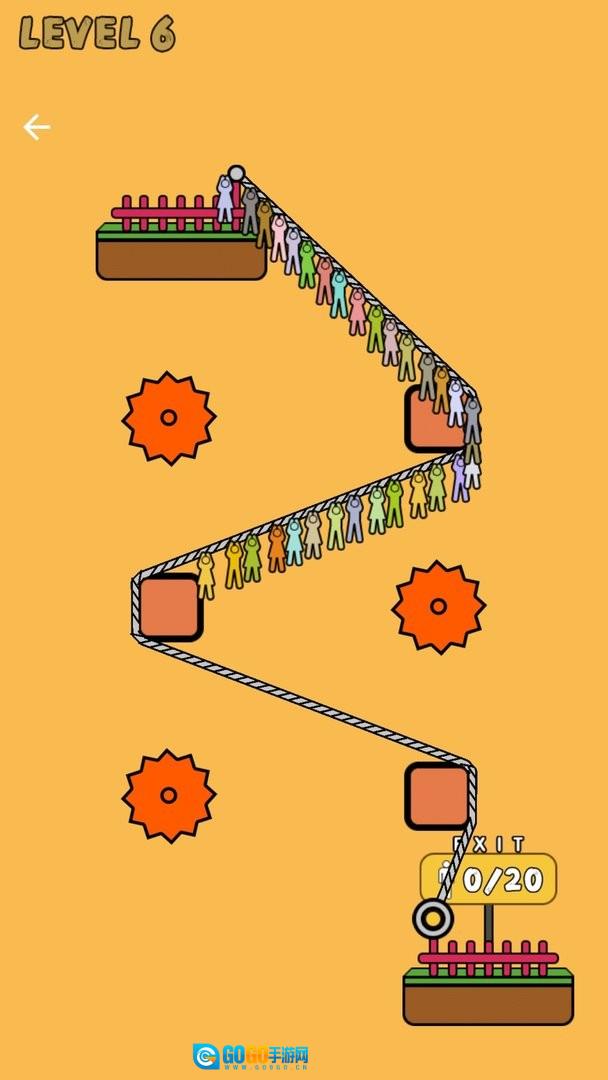 绳索逃生是一款以绳索操控为核心的益智闯关游戏,目标是完成多人安全转移的挑战。你需要仔细观察场景中的机关分布,借助绳索的绑定功能连接不同支点,同时巧妙避开旋转的锯齿陷阱,引导所有角色顺着绳索移动到安全区域。每一关的布局都暗藏玄机,十分考验玩家的空间思维与应变能力。