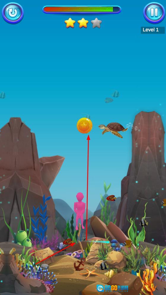 2、操控粉色角色在水下场景中移动,借助滑动、点击等操作指引角色或物体避开障碍,并利用场景中的元素规划行进路径。