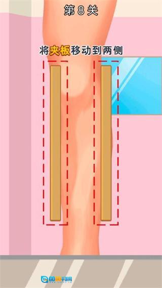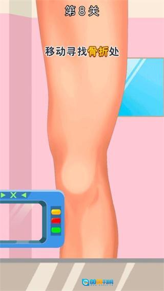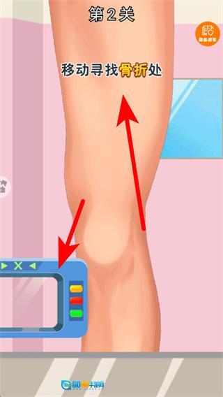 4、进入第2关后,按照屏幕上红色箭头的指示,移动X光仪这类检测工具对腿部区域进行扫描,找到骨折的具体位置,以此推动骨骼诊疗工作的进展。