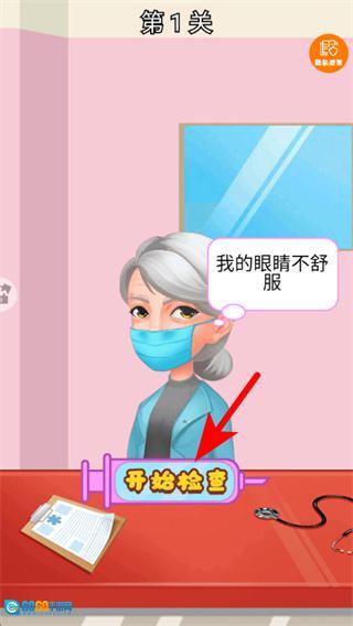 2、在第1关里,按照红色箭头的提示,点击开始检查按钮,就能进入患者病症的处理流程,针对眼睛不适的症状开展诊疗工作。