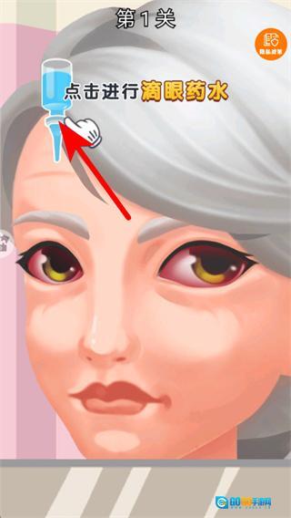 3、跟着红色箭头的指引,点击滴眼药水的道具,给患者眼部滴药,完成这一关的眼部诊疗任务。