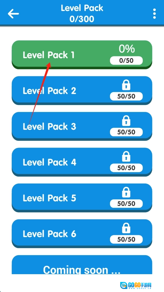 2、进入关卡选择界面,按照箭头指引,选择LevelPack 1,确认关卡后,点击对应关卡进行选择。