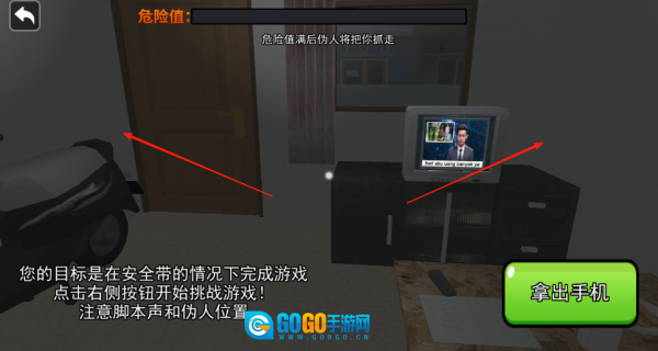 2、接下来最基础的操作是直接点击并旋转屏幕,以此切换视角,查看伪人是否在附近,之后再拿出手机。