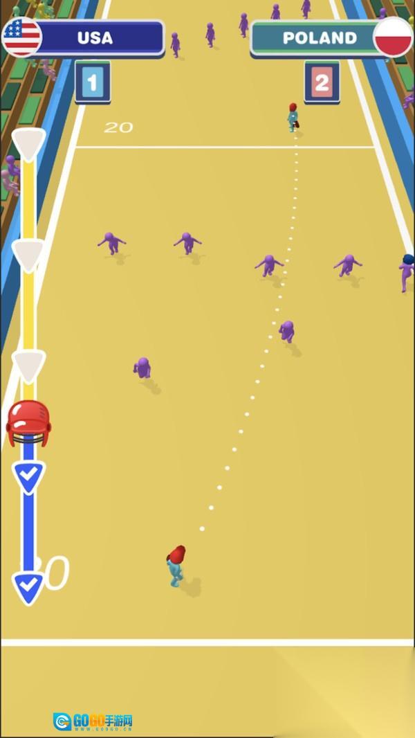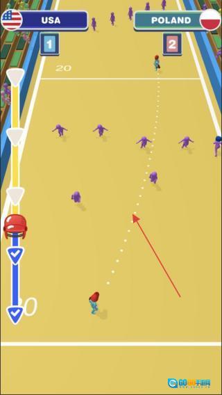 2、在跑垒对抗的场景切换中,当美国队完成击球动作后,需要操控跑垒员沿着由白点构成的轨迹全力冲刺,同时避开波兰队(POLAND)的防守,努力达成得分目标。