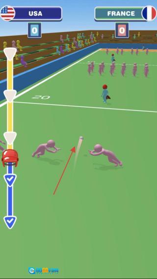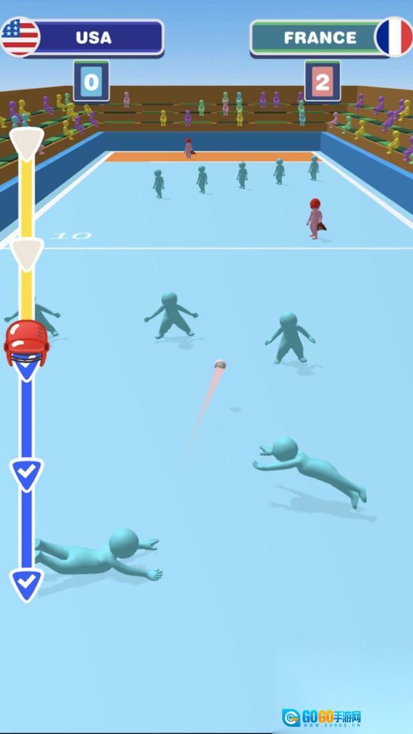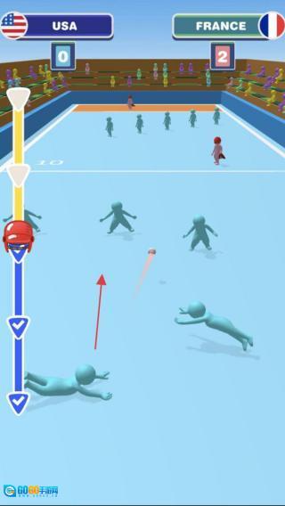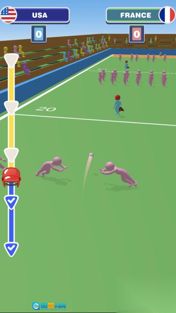 3、防守拦截环节,当法国队处于防守状态时,操控球员,提前判断棒球的运动轨迹(红箭头所示),通过滑动屏幕的方式进行拦截,以此阻止美国队得分,从而完成“投-打-守”的循环对战流程。