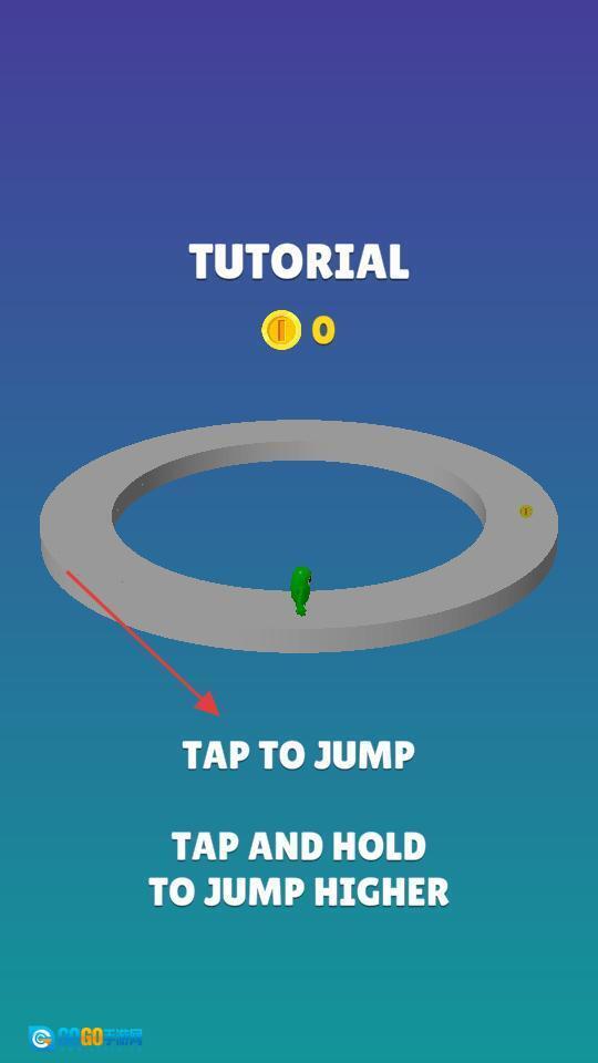 1、进入奔跑着色的教学关卡,先查看操作指引,按照提示点击屏幕能让绿色角色跳跃,长按屏幕则可实现更高跳跃,借助点击和长按这两种操作,熟悉角色的跳跃方式。