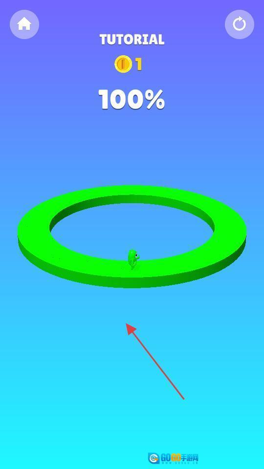 2、操控绿色角色在环形赛道上移动,通过持续点击或长按屏幕让角色跳跃,以此完成赛道的行进任务。当界面上显示出百分百进度时,意味着教学关卡已顺利完成,接下来就可以准备领取奖励了。