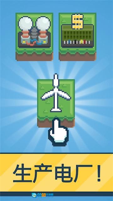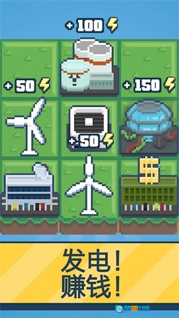 1、游戏采用十分有趣的像素风格画面,你可以在这里开启全新的冒险之旅,当积累到一定程度后,就能不断扩大自己的地盘,还能在这里持续建造更多的发电场。