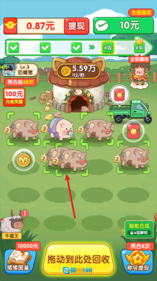 2、把相同的小猪拖动到一起重叠,就能合成出更高级别的小猪。