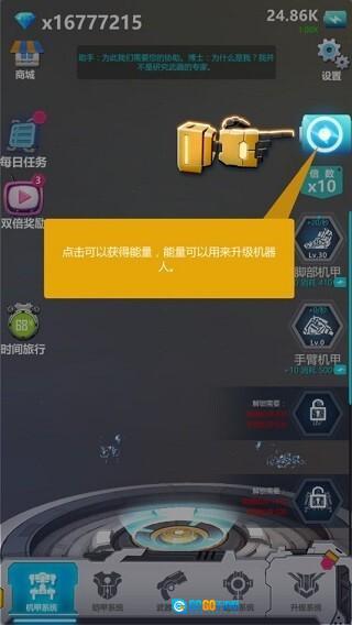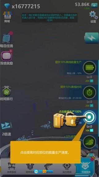 点击屏幕就能获取能量,这些能量可用于机器人的升级。这款游戏采用放置点击的玩法,持续点击即可积累大量能量——能量的数值会直接影响机器人的建造速度,能量越多,建造进程就越快。等把机器人的系统都完善好,你就能感受到游戏的乐趣了,记得保持足够的耐心哦。