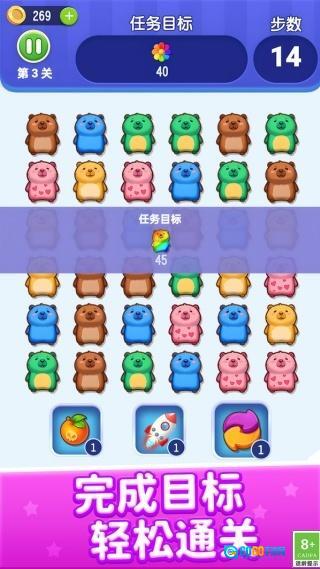 1、萌系视觉风格有着很强的亲和力,画面色彩明亮鲜活,角色形象软萌讨喜,让消除玩法多了不少治愈感和观赏性。