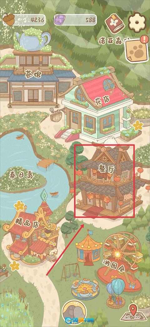3、进入小镇后,找到并点击进入餐厅
