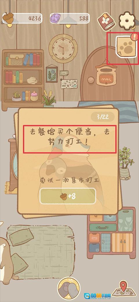1、进入游戏后,玩家需按照右上角爪子图标里的任务提示完成任务,完成后能获取奖励,比如到餐馆购买便当、努力打工等。