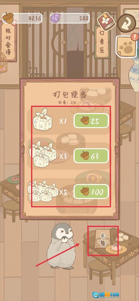 4、在餐厅里点击桌上的点餐按钮,接着选择便当完成购买