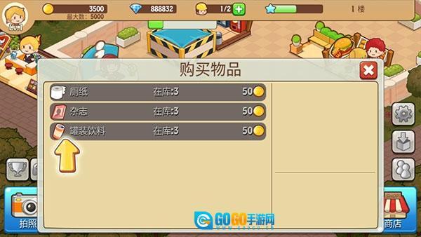 3、让我们选购一些物品,现在请选择「汉堡店」,我们会用「罐装饮料」来增加收入。要是你继续建造新设施,就会需要更大的空间,那就让我们把你的商店扩建一下吧!