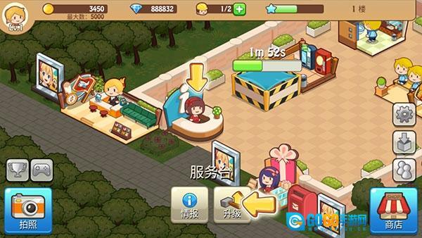 4、点击“服务台”后选择“升级”选项,能够扩大楼层面积,从而建造更多商铺。