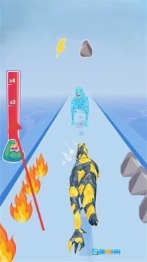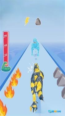 2、切换至黄色机甲恐龙形态,在跑道上利用闪电等增益效果,避开火焰与石块的阻碍,保持奔跑并不断变形。